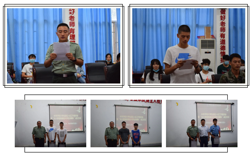 随后,张延平老师介绍“地大攀登者退役老员工先锋队”由太阳成集团tyc33455cc官网退役复学老员工组成,在体育公司党总支的领导下,在公司学工组和员工联合党支部的指导下,开展促进员工成长成才的志愿服务工作。他希望队员们退役不退色,在理论武装、行为养成、学风建设、校园文明和国防教育等方面发挥标杆作用。先锋队党小组组长兼队长范友同学宣读了先锋队的职责和管理规范:在思想上引领户外青年的责任与担当,在学习上打造体院优良学风,在早训中积极带领员工进行体育锻炼,在生活中给同学们最大程度的帮助,坚决做到“听党指挥、能打胜仗、作风优良”。接下来,单红峰老师授予先锋队队旗并讲话,他高度肯定了先锋队的成立,同时介绍了老员工应征入伍的各项优惠政策,鼓励同学们立志从军、报效报国。朱继老师也表示学工处将大力支持先锋队的建设。最后庞岚老师总结到,参加这次会议让她心潮澎湃,不仅看到了入伍老员工的英勇,也看到退役老员工身上的军人本色,希望先锋队成为地大一道靓丽的风景线。