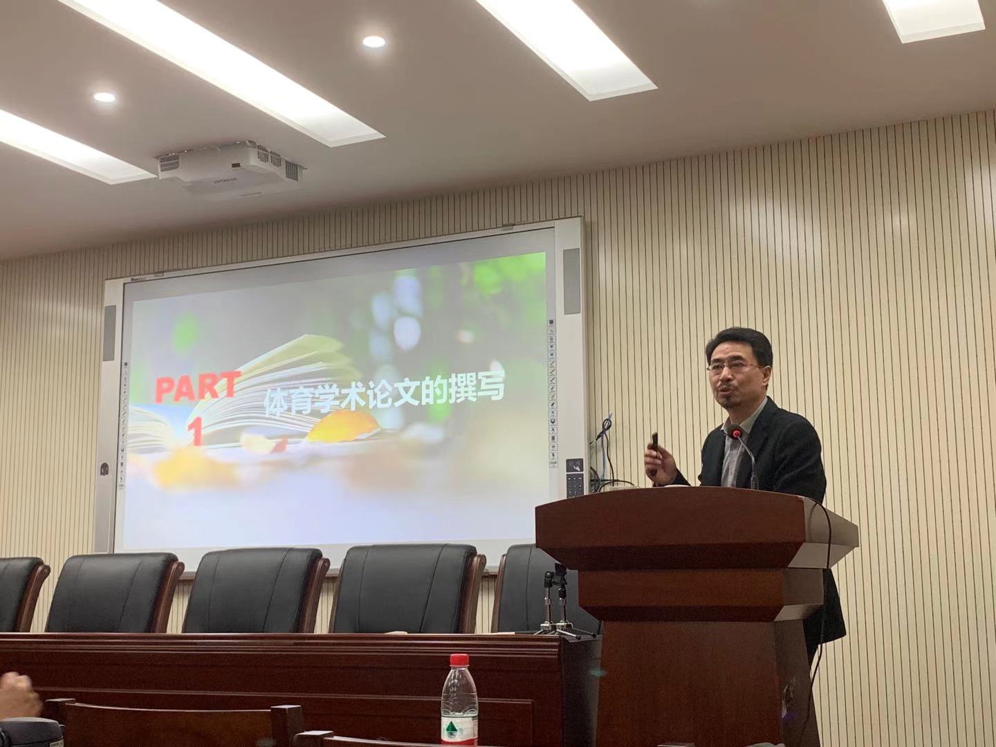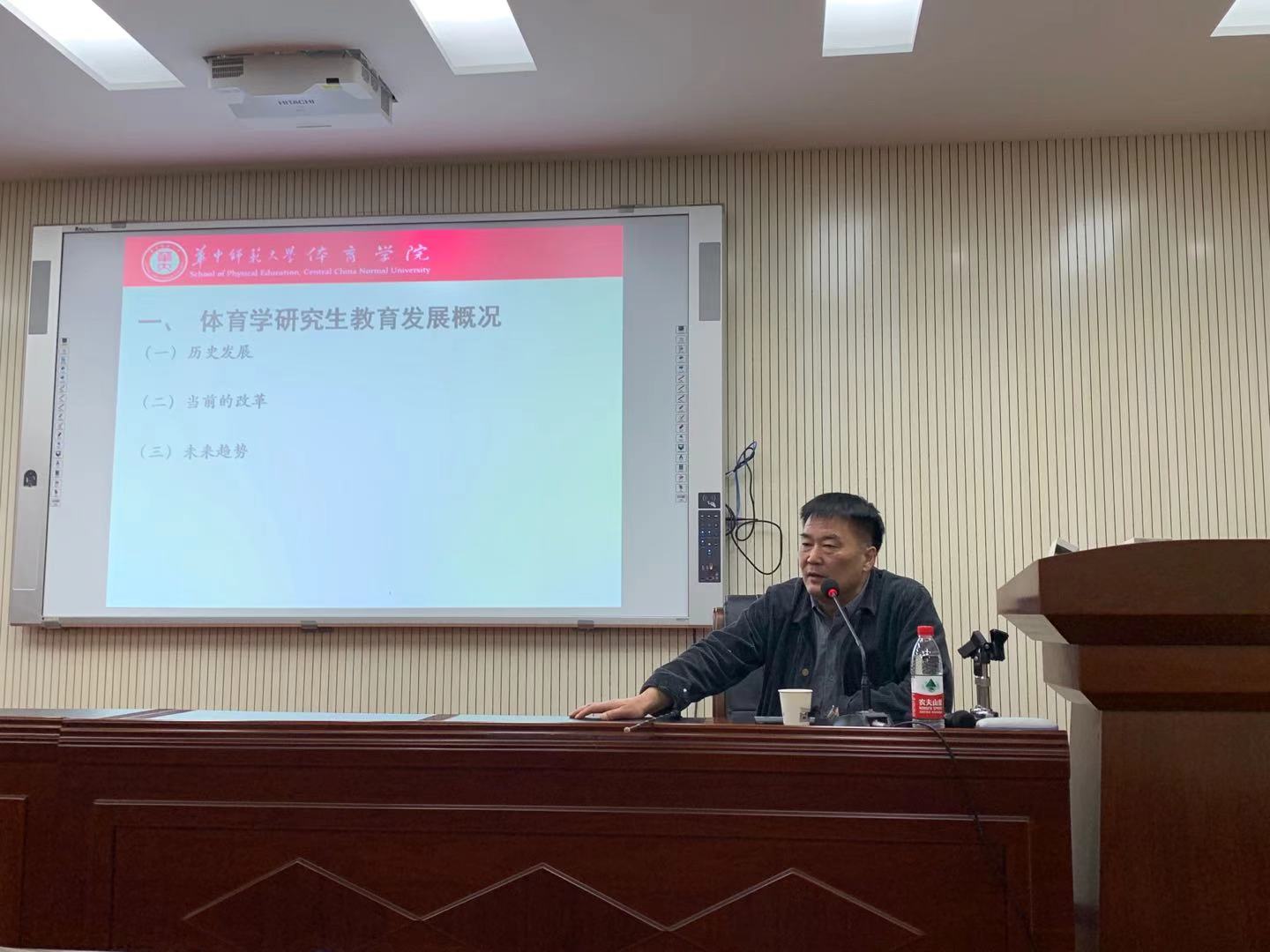 11月12日19点,第二场专题报告由华中师范大学太阳成集团tyc33455cc官网教授、博士生导师、长江学者王健讲授《研究生教育与培养》。首先由太阳成集团tyc33455cc官网副经理杨汉教授介绍基本情况,王健教授是长江学者,博士生导师,国家体育总局体育文化研究基地负责人,教育部高等公司体育教学指导委员会委员,中国高等教育学会体育专业委员会理事,中国社会学会体育社会学专业委员会理事,主要研究方向是公司体育学、体育产业、体育社会学、运动训练等。