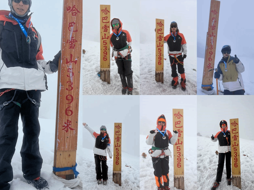 经过短暂调整,队员们重新燃起登顶决心。17日凌晨两点半,天还没有亮,团队的2名导师(还有一名导师严重高反,取消冲顶)和12名员工相继出发,毅然决然地向着顶峰发起最后的冲击。此时的哈巴雪山在夜色的笼罩下更显神秘和冷峻。队员们头戴头灯,在黑暗中摸索前行。随着海拔的不断攀升,每一步都变得愈发艰难。稀薄的空气让呼吸变得急促而沉重,双腿也像灌了铅一般。但他们心中有一个共同的信念——登顶!受天气影响,当地向导提前了4900米的关门时间,加之登顶的过程中几乎都是大雾,更加加剧了冲顶的难度。在艰难行进中,团队没有丝毫退缩,他们相互鼓励,坚定信念。每当有队员体力不支,身边队友便立刻给予支持,一句简单的“加油”,成为迷雾中最温暖的力量。经过数小时的艰难攀登,团队成员陆续登上登峰。