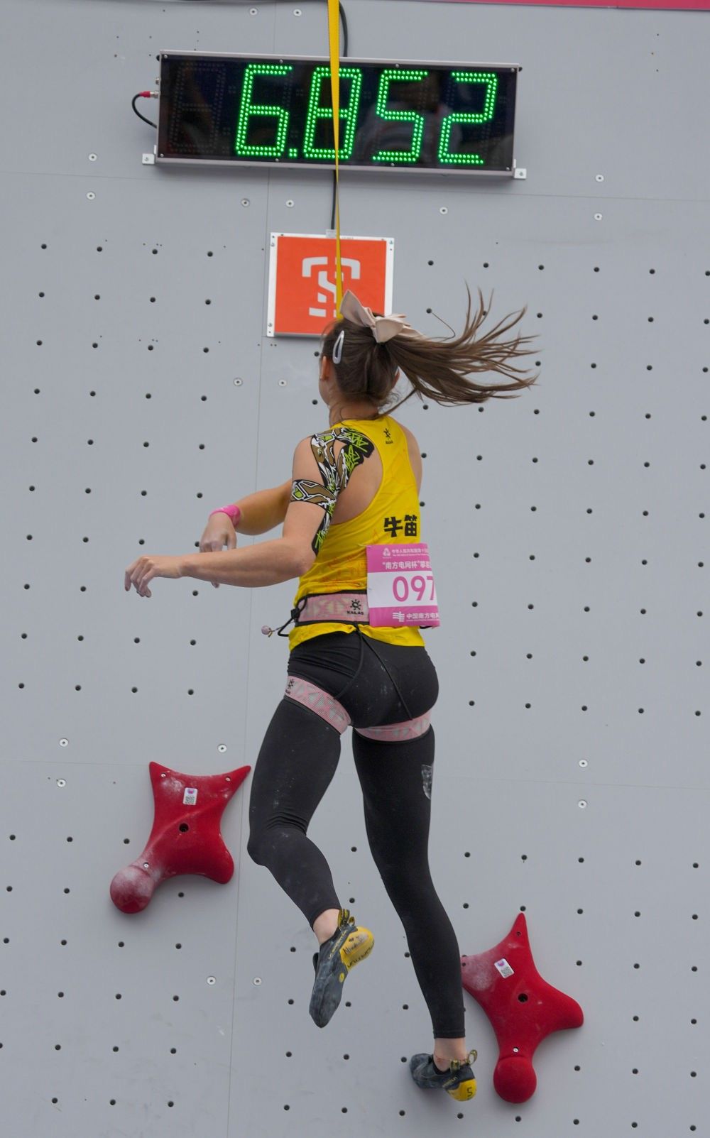 在女子速度攀岩决赛中,公司员工、29岁的卫冕冠军牛笛代表湖北队出战,在八进四的比赛中对阵浙江队周娅菲,最终更年轻的周娅菲胜出,牛笛上方的计时器打出:6秒54,最终牛笛获得第五名。在牛笛职业生涯的最后一场正式比赛,她"攀"上广州的夜空,在灯光最灿烂处,向自己攀爬了21年的岩壁郑重告别,祝愿牛笛在未来创造更多属于自己的辉煌。