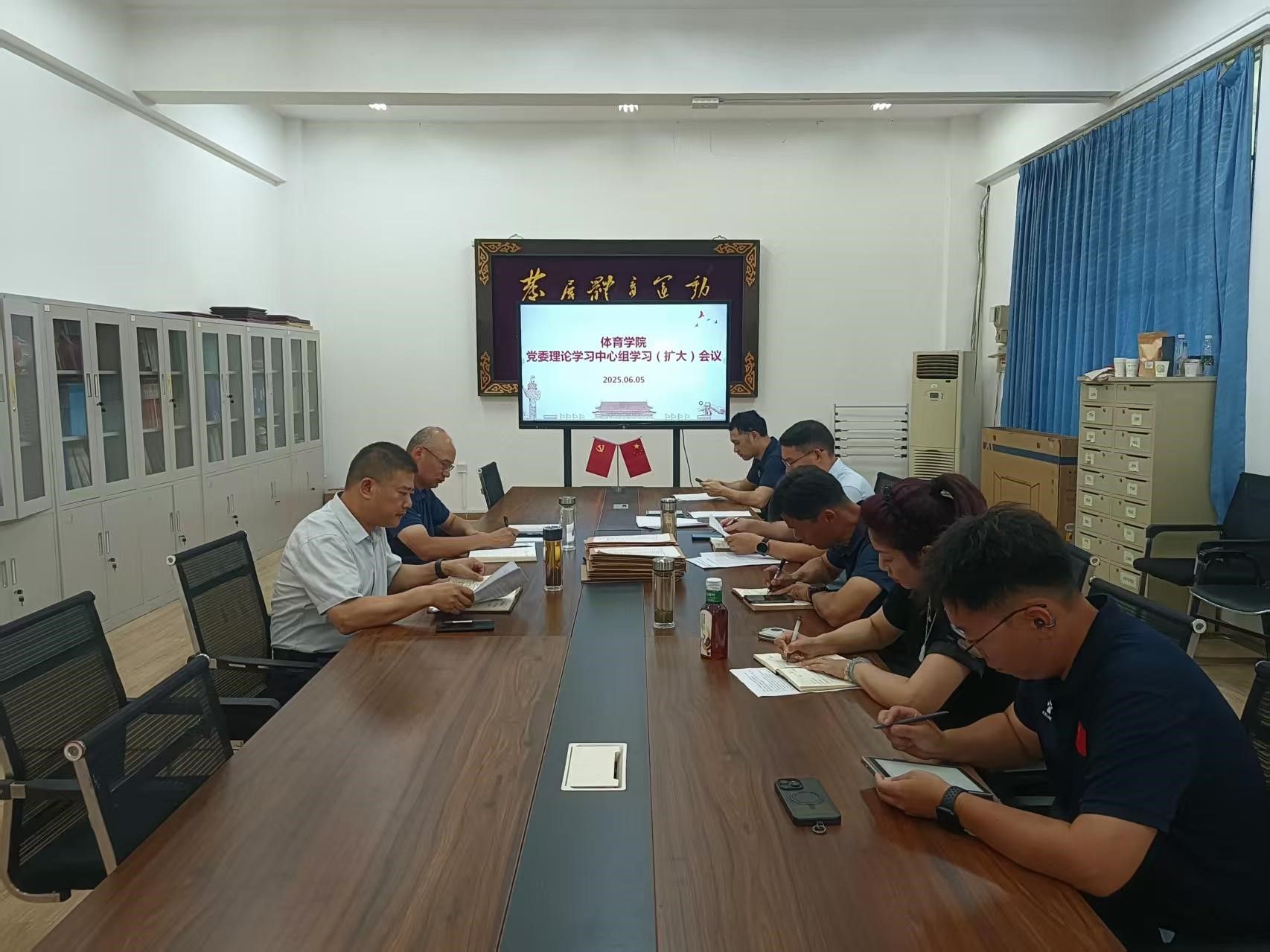 2025 年 6 月 5 日下午 2:30,体育公司党委理论学习中心组学习(扩大)会议在体育馆党员之家举行。会议由何建新书记主持,公司党委委员参会,教师党支部书记列席会议。