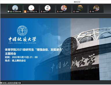 3月15日晚,2021级研究生在腾讯会议线上开展“增强自信,发掘潜力”主题班会,团支书秦绍瑞主持会议。罗忠苹感悟:“参加这次班会,给我感触最大的便是自信这个话题,当前研究生面临的科研压力和就业压力越来越大。但是,作为新时代的四有青年,我们应该端正思想态度,制定自己的目标计划,并为之努力奋斗,振奋精神,自信坚强,积极向上!”