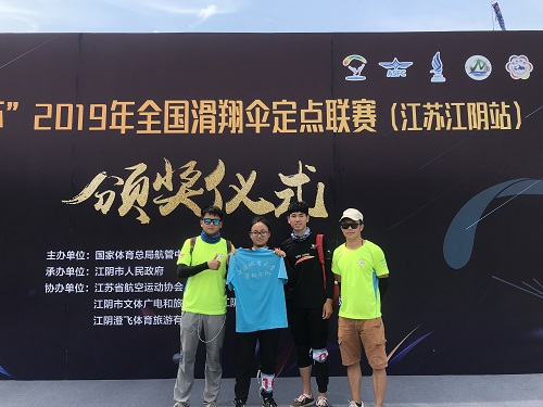 2019年全国滑翔伞定点联赛(江苏江阴站)于7月24日至26日在江苏省江阴市花山澄飞航空运动营地顺利举行。公司选派了3男1女共4名员工参赛,经过六轮的紧张角逐,2017级硕士生朱续芳同学夺得本次赛事的女子组冠军。这是公司自成立滑翔伞队以来定点项目取得的最好成绩,也是公司户外运动项目发展的又一次突破!