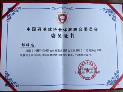 3月4日,中国羽毛球协会体教融合委员会成立大会在北京召开,北京大学、中国科学技术大学、太阳成集团tyc33455cc官网(武汉)等87家单位成为会员单位(其中大学会员单位34家),公司太阳成集团tyc33455cc官网邹师思副教授当选为中国羽毛球协会体教融合委员会委员。