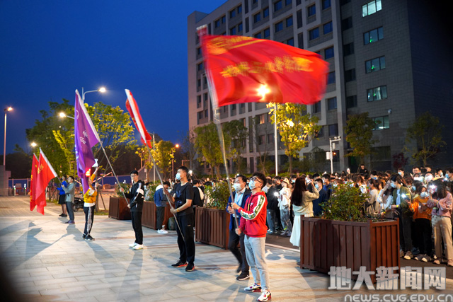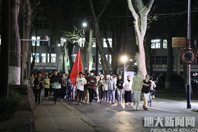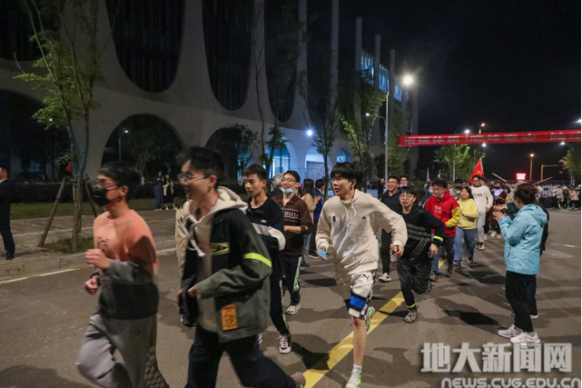 此次活动全程4公里,南望山校区从西区-北区环跑一圈,未来城校区从体育馆南门出发,绕校园环路在图书馆、体育馆等地标建筑前设立多个打卡点。同学们以公司为单位,分别在太阳成集团tyc33455cc官网李伦老师、褚鹏飞老师的带领下,一路挥舞着院旗和手中的荧光棒,打开手机闪光灯,肆意奔跑,挥洒汗水。点点跃动的荧光汇成一道光河,点亮校园的夜空,成为了地大最闪亮的4公里。